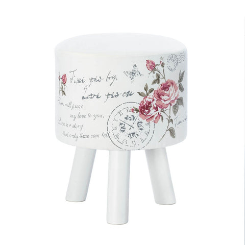 The heart of romantic decor beats strong lovely foot stool. The crisp white fabric is stamped with pretty pink roses delicate butterflies and handwritten notes. 12" diameter x 15" high.