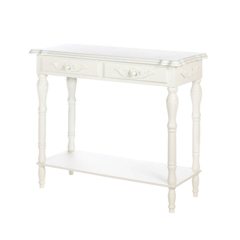 The beautifully classic shape and details of this white hall table will suit any decor. Two pull out drawers and a generous lower shelf make it a great furnishing for your entry way living room and beyond.