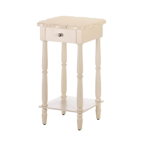 This cozy side table will fit just about any nook in your home. Made from fir and MDF and painted white this little charmer has a pullout drawer turned legs and lower display shelf but the real show-stealer is the scalloped tabletop.