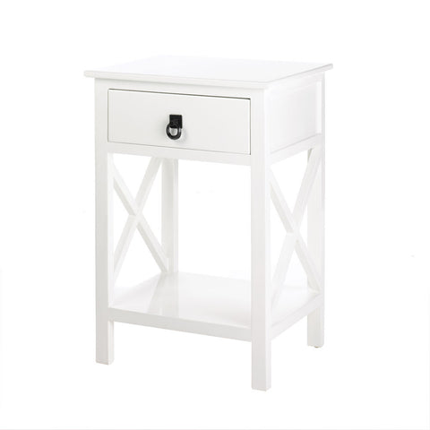 Brighten your room with this classic coastal-inspired side table. Lacquered finished in white this sleek and handsome furnishing features a pullout drawer for storage highlighted by a contrasting metal pull and a bottom shelf that can be used for additional storage or display.