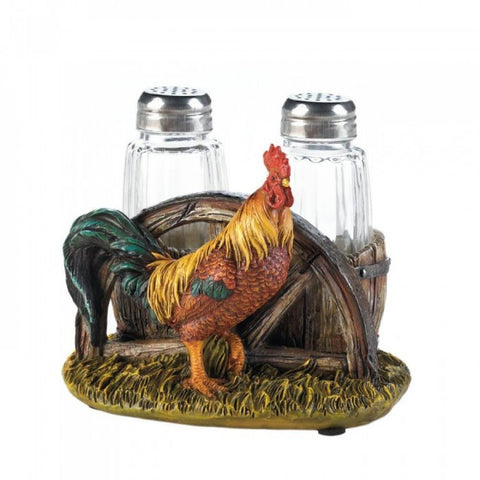 Bring a little country farm style to your kitchen with this charming addition. It features glass salt and pepper shakers set in a polyresin sculptural base that looks like rain barrels along with a rooster strutting in front of a wagon wheel.