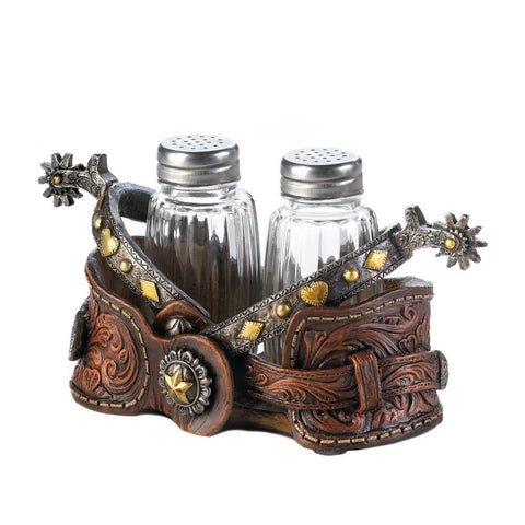 Pass the salt and pepper with a whole lot of cowboy flair! Glass and iron salt and pepper shakers fit snugly inside this charming polyresin holder that brings a dash of the Wild West to your dinner table.