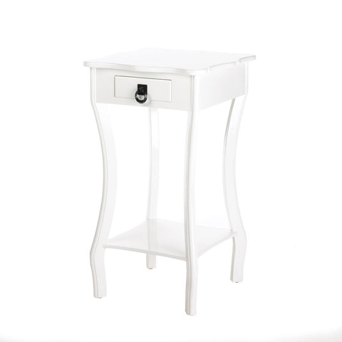 This sleek accent table attests to your outgoing design style while complementing your current décor. Curved legs highlight the lower shelf and the scalloped tabletop is striking with or without anything displayed on it. The table lacquered finished in white also features a pullout drawer with a dark metal ring pull.