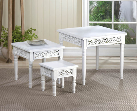 Three charming accent tables with flourishing cutouts neatly tuck together to create an eye-catching room accent. Whether nested together or used separately around your living space these noteworthy white tables are as chic as they are functional!