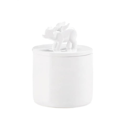 Bring a smile and a little more storage to your space with this absolutely charming jar. The lid will steal the spotlight in any room thanks to a little piglet outfitted with wings.