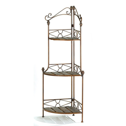 Tuck this lovely shelf into a drab corner add your favorite collectibles or plants and you've got an instant designer display! Warm wood tones and ornamental scrollwork add timeless style. Weight 12 lbs. Wood and metal. Plants not included. 14" x 14" x 47" high.