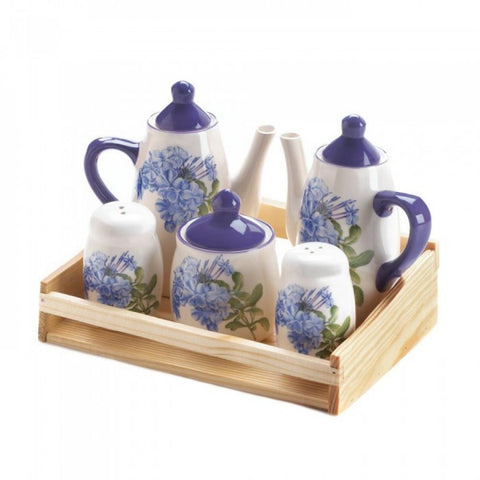 This precious set will look great on your table! The fir wood box holds five precious pieces of dolomite including 2 teapots a sugar container and a salt an pepper shaker. Each piece is embellished with a lovely floral design.