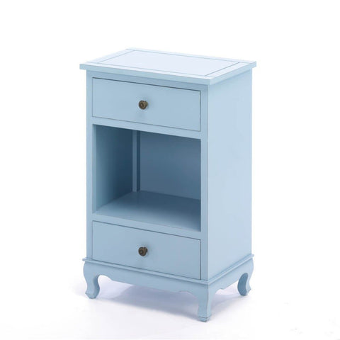The gentle calming misty blue of this elegant side table lends a breath of fresh air to any space. This classic side table features two pullout drawers a center display shelf and handsome details that will splash your bedroom or living room with style.