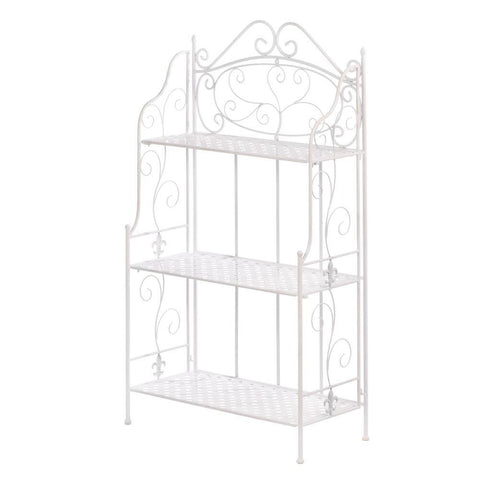 Add style and organization to your room with this beautiful white bakers rack. It features three basket weave shelves scrolling flourishes for added style and a few fleur de lis accents that are the perfect finishing touch.