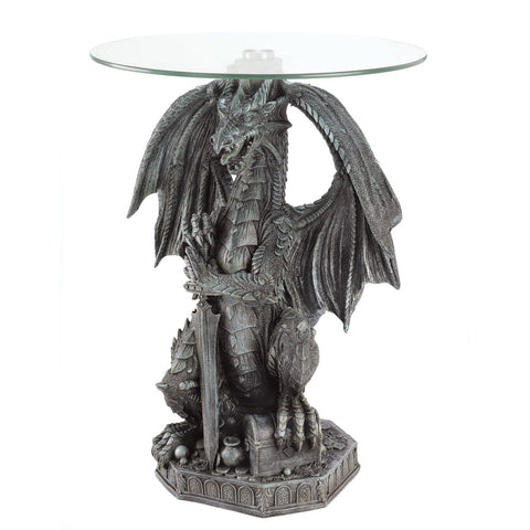 Stunning stone-look statue table features a hissing dragon standing guard over his lord's treasure trove. Styled to resemble centuries-old castle gargoyles this is a worthy decoration for the chamber of any king!